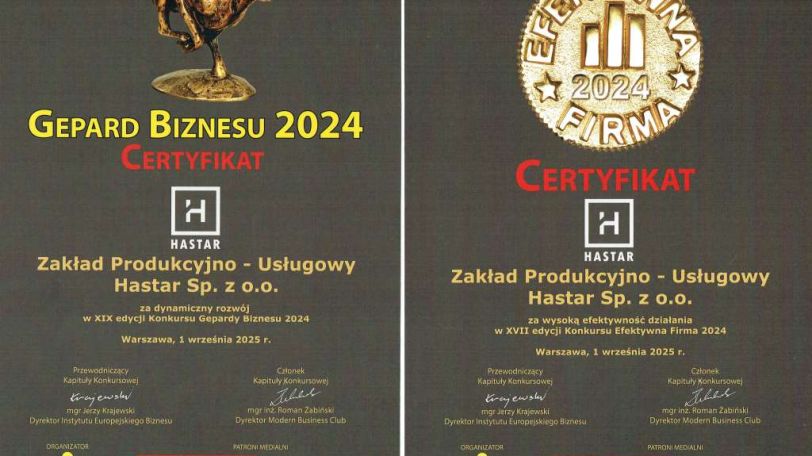 Zakład Produkcyjno-Usługowy Hastar Sp. z o.o. ze Skarżyska-Kamiennej został wyróżniony przez Instytut Europejskiego Biznesu w XVII edycji Konkursu Brylanty Polskiej Gospodarki 2024 oraz Konkursu Efektywna Firma 2024!